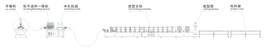開卷機(jī)---較平一體機(jī)---沖孔----成型機(jī)組----成型剪-----放料架