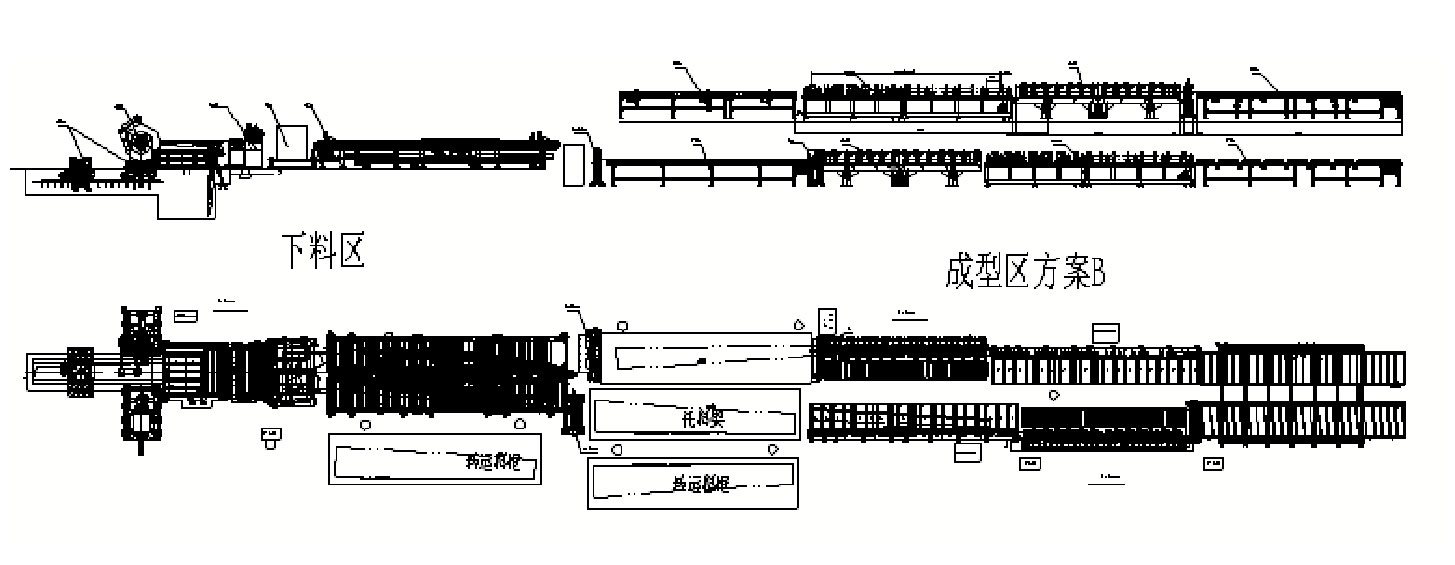 2 該生產線能生產多種板寬、截面、長度的頂板,更換規(guī)格時需調整縱橫剪角度、沖缺口模具和切端頭擋料僅需調整相對位置,真空吸盤和翻邊壓料塊需根據板型不同做相應更換,集中沖孔則需要根據板型的不同,調整個別沖孔機,無需全部調整。通過以上操作,便可實現多種板型的生產。